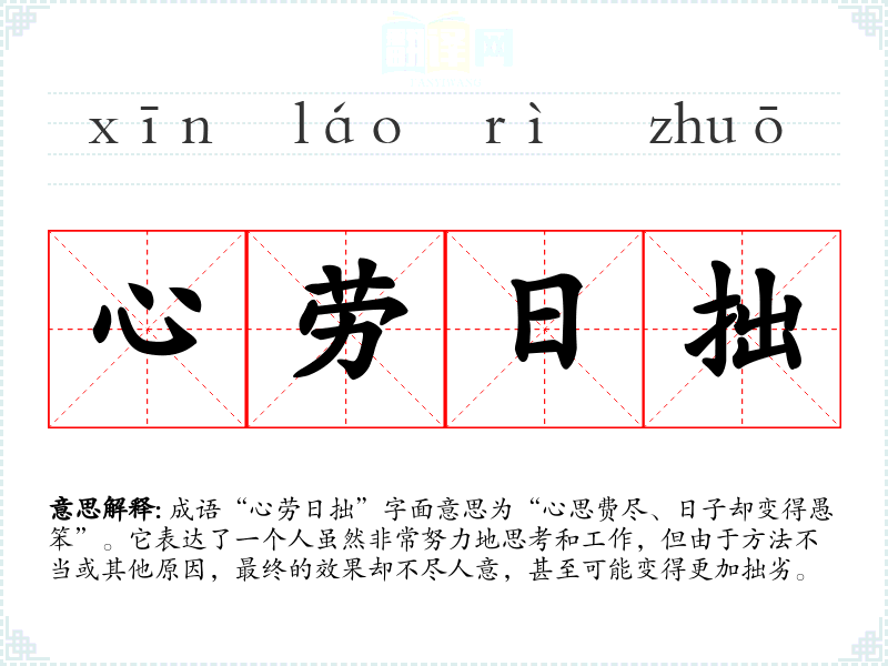 成语“心劳日拙”字面意思为“心思费尽、日子却变得愚笨”。它表达了一个人虽然非常努力地思考和工作,但由于方法不当或其他原因,最终的效果却不尽人意,甚至可能变得更加拙劣。