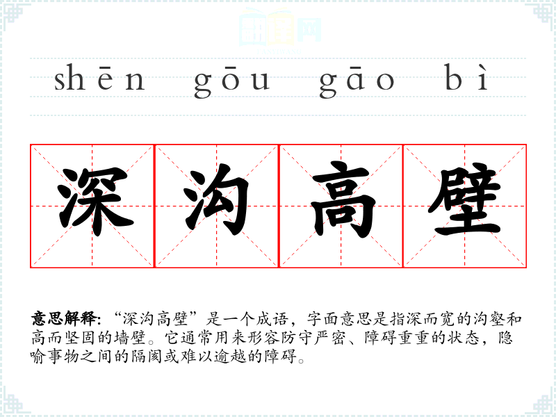 “深沟高壁”是一个成语,字面意思是指深而宽的沟壑和高而坚固的墙壁。它通常用来形容防守严密、障碍重重的状态,隐喻事物之间的隔阂或难以逾越的障碍。