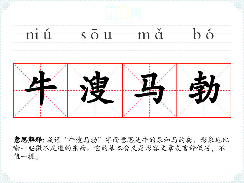 成语“牛溲马勃”字面意思是牛的尿和马的粪,形象地比喻一些微不足道的东西。它的基本含义是形容文章或言辞低劣,不值一提。