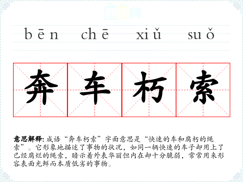 成语“奔车朽索”字面意思是“快速的车和腐朽的绳索”。它形象地描述了事物的状况,如同一辆快速的车子却用上了已经腐烂的绳索,暗示着外表华丽但内在却十分脆弱,常常用来形容表面光鲜而本质低劣的事物。