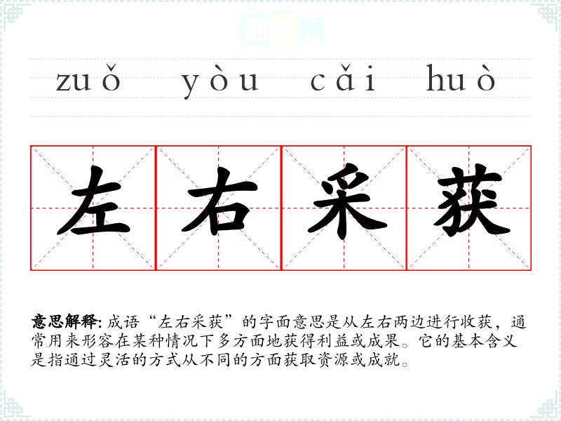 成语“左右采获”的字面意思是从左右两边进行收获,通常用来形容在某种情况下多方面地获得利益或成果。它的基本含义是指通过灵活的方式从不同的方面获取资源或成就。