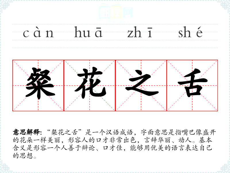 “粲花之舌”是一个汉语成语,字面意思是指嘴巴像盛开的花朵一样美丽,形容人的口才非常出色,言辞华丽、动人。基本含义是形容一个人善于辩论、口才佳,能够用优美的语言表达自己的思想。