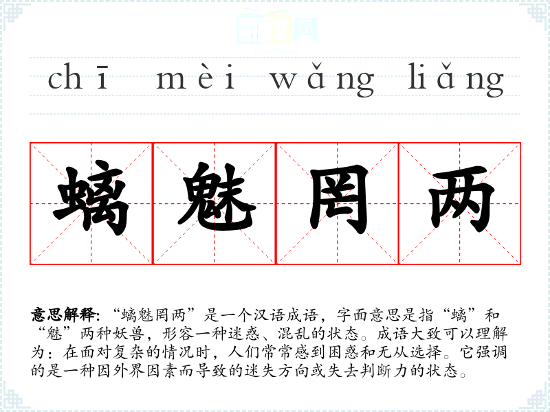 “螭魅罔两”是一个汉语成语,字面意思是指“螭”和“魅”两种妖兽,形容一种迷惑、混乱的状态。成语大致可以理解为:在面对复杂的情况时,人们常常感到困惑和无从选择。它强调的是一种因外界因素而导致的迷失方向或失去判断力的状态。