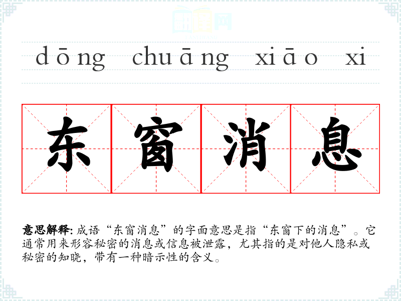成语“东窗消息”的字面意思是指“东窗下的消息”。它通常用来形容秘密的消息或信息被泄露,尤其指的是对他人隐私或秘密的知晓,带有一种暗示性的含义。