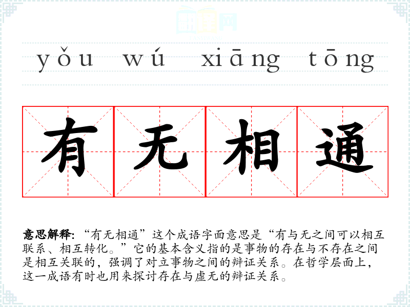 “有无相通”这个成语字面意思是“有与无之间可以相互联系、相互转化。”它的基本含义指的是事物的存在与不存在之间是相互关联的,强调了对立事物之间的辩证关系。在哲学层面上,这一成语有时也用来探讨存在与虚无的辩证关系。