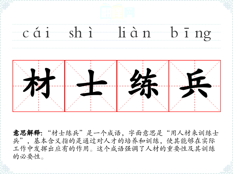 “材士练兵”是一个成语,字面意思是“用人材来训练士兵”,基本含义指的是通过对人才的培养和训练,使其能够在实际工作中发挥出应有的作用。这个成语强调了人材的重要性及其训练的必要性。