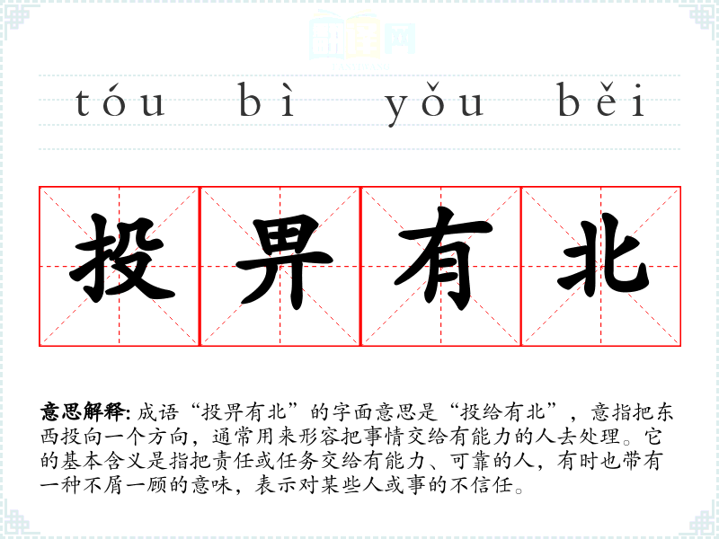 成语“投畀有北”的字面意思是“投给有北”,意指把东西投向一个方向,通常用来形容把事情交给有能力的人去处理。它的基本含义是指把责任或任务交给有能力、可靠的人,有时也带有一种不屑一顾的意味,表示对某些人或事的不信任。