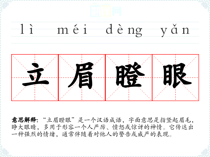 “立眉瞪眼”是一个汉语成语,字面意思是指竖起眉毛,睁大眼睛,多用于形容一个人严厉、愤怒或惊讶的神情。它传达出一种强烈的情绪,通常伴随着对他人的警告或威严的表现。
