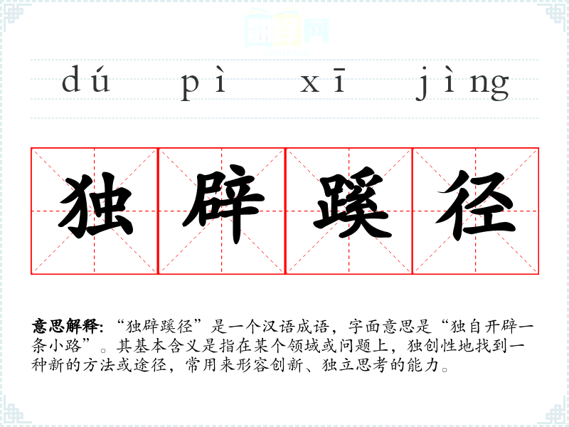 “独辟蹊径”是一个汉语成语,字面意思是“独自开辟一条小路”。其基本含义是指在某个领域或问题上,独创性地找到一种新的方法或途径,常用来形容创新、独立思考的能力。