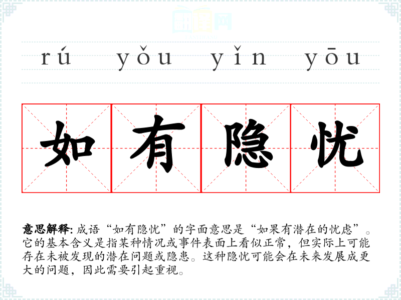 成语“如有隐忧”的字面意思是“如果有潜在的忧虑”。它的基本含义是指某种情况或**表面上看似正常,但实际上可能存在未被发现的潜在问题或隐患。这种隐忧可能会在未来发展成更大的问题,因此需要引起重视。