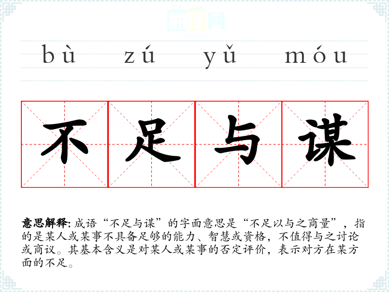 成语“不足与谋”的字面意思是“不足以与之商量”,指的是某人或某事不具备足够的能力、智慧或资格,不值得与之讨论或商议。其基本含义是对某人或某事的否定评价,表示对方在某方面的不足。