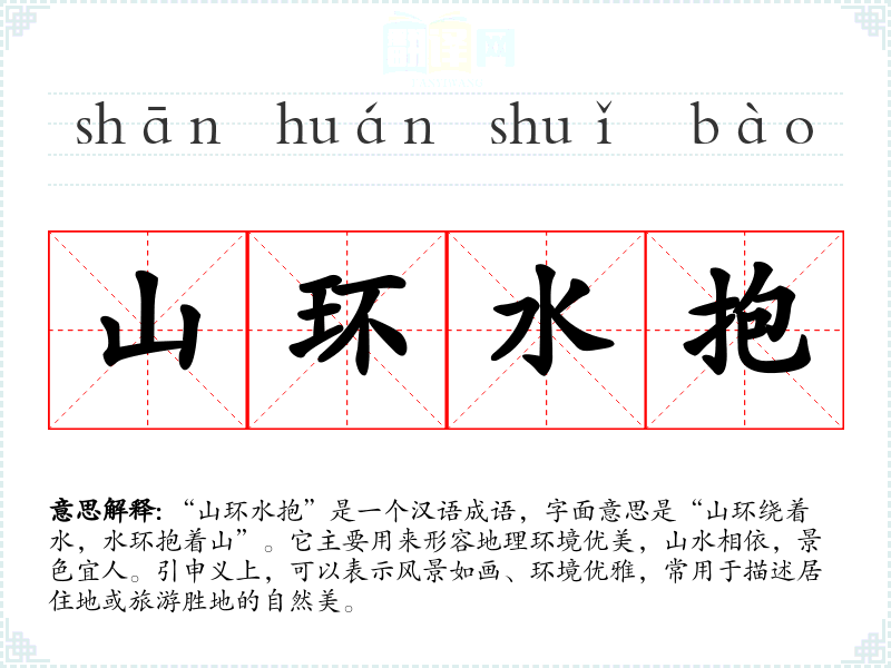 成语“山环水抱”的具体来源并不明确,但其字面含义可以追溯到古代文人对自然景观的描绘。山和水在文化中常常被视为自然美的代表,许多古典文学作品中都有对于山水的赞美。比如,唐代诗人王维的诗句常常描写山水之美,体现出人与自然的和谐共处。