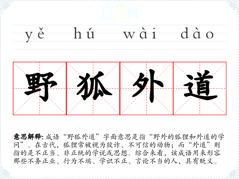 成语“野狐外道”字面意思是指“野外的狐狸和外道的学问”。在古代,狐狸常被视为狡诈、不可信的动物;而“外道”则指的是不正当、非正统的学说或思想。综合来看,该成语用来形容那些不务正业、行为不端、学识不正、言论不当的人,具有贬义。