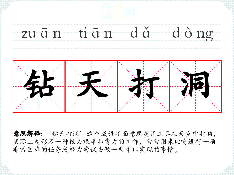 “钻天打洞”这个成语字面意思是用工具在天空中打洞,实际上是形容一种极为艰难和费力的工作,常常用来比喻进行一项非常困难的任务或努力尝试去做一些难以实现的事情。