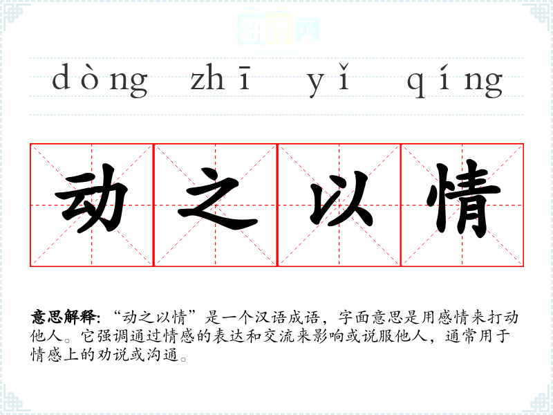 “动之以情”是一个汉语成语,字面意思是用感情来打动他人。它强调通过情感的表达和交流来影响或说服他人,通常用于情感上的劝说或沟通。