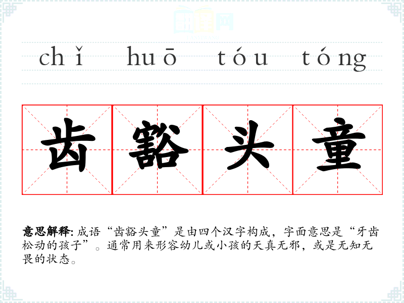 成语“齿豁头童”是由四个汉字构成,字面意思是“牙齿松动的孩子”。通常用来形容幼儿或小孩的天真无邪,或是无知无畏的状态。