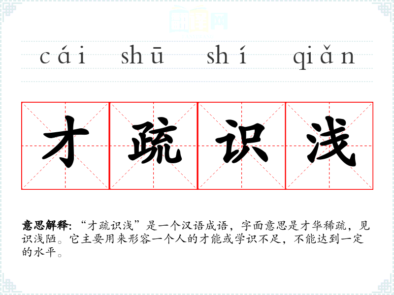 - 识浅才疏:与“才疏识浅”意思相同,表示学识和才能均不高。