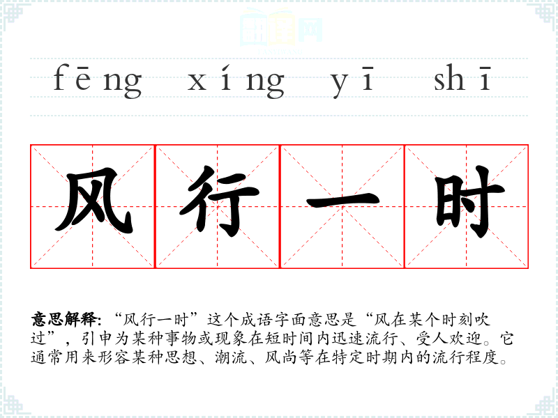 “风行一时”这个成语字面意思是“风在某个时刻吹过”,引申为某种事物或现象在短时间内迅速流行、受人欢迎。它通常用来形容某种思想、潮流、风尚等在特定时期内的流行程度。