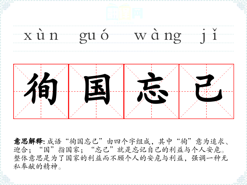 成语“徇国忘己”由四个字组成,其中“徇”意为追求、迎合;“国”指国家;“忘己”就是忘记自己的利益与个人安危。整体意思是为了国家的利益而不顾个人的安危与利益,强调一种无私奉献的精神。