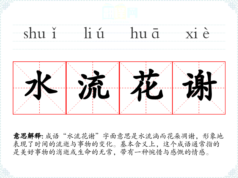 成语“水流花谢”字面意思是水流淌而花朵凋谢,形象地表现了时间的流逝与事物的变化。基本含义上,这个成语通常指的是美好事物的消逝或生命的无常,带有一种惋惜与感慨的情感。