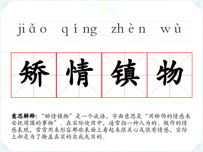 “矫情镇物”是一个成语,字面意思是“用矫饰的情感来安抚周围的事物”。在实际使用中,通常指一种人为的、做作的情感表现,常常用来形容那些表面上看起来很关心或很有情感,实际上却是为了掩盖真实的自我或目的。