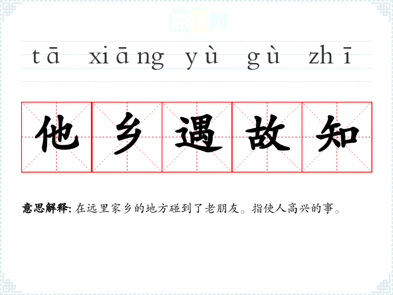| 他乡故知 | 故知:老朋友,熟人。在异地遇到老朋友或熟人。 |