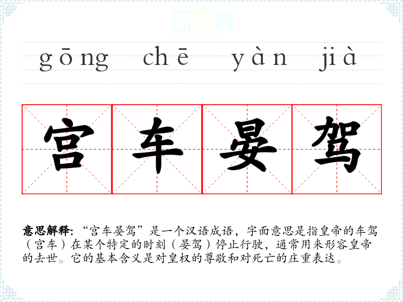宫车晏驾 晏:迟。宫车迟出。旧为帝王死亡的讳辞。