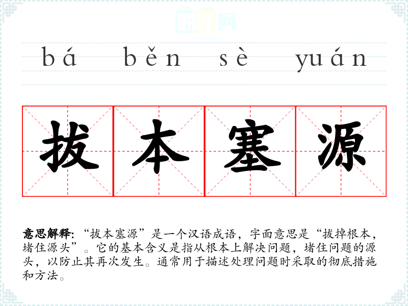 “拔本塞源”是一个汉语成语,字面意思是“拔掉根本,堵住源头”。它的基本含义是指从根本上解决问题,堵住问题的源头,以防止其再次发生。通常用于描述处理问题时采取的彻底措施和方法。