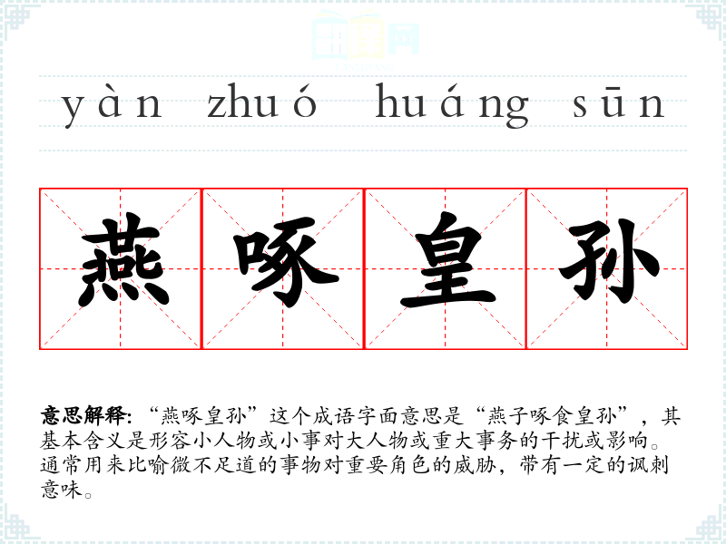 “燕啄皇孙”这个成语字面意思是“燕子啄食皇孙”,其基本含义是形容小人物或小事对大人物或重大事务的干扰或影响。通常用来比喻微不足道的事物对重要角色的威胁,带有一定的讽刺意味。