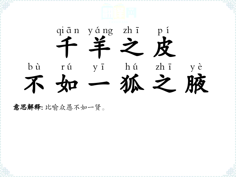 镒:古时重量单位,合二十两;白:狐狸腋下的白毛皮。价值千金的皮衣,不是用一只狐狸的毛制成的。比喻治国需要众多人才的力量。 |