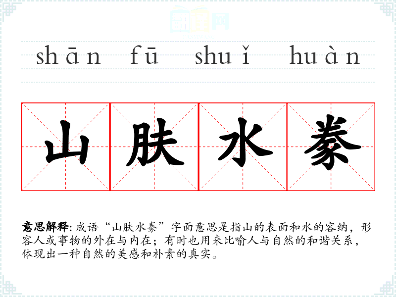 成语“山肤水豢”字面意思是指山的表面和水的容纳,形容人或事物的外在与内在;有时也用来比喻人与自然的和谐关系,体现出一种自然的美感和朴素的真实。