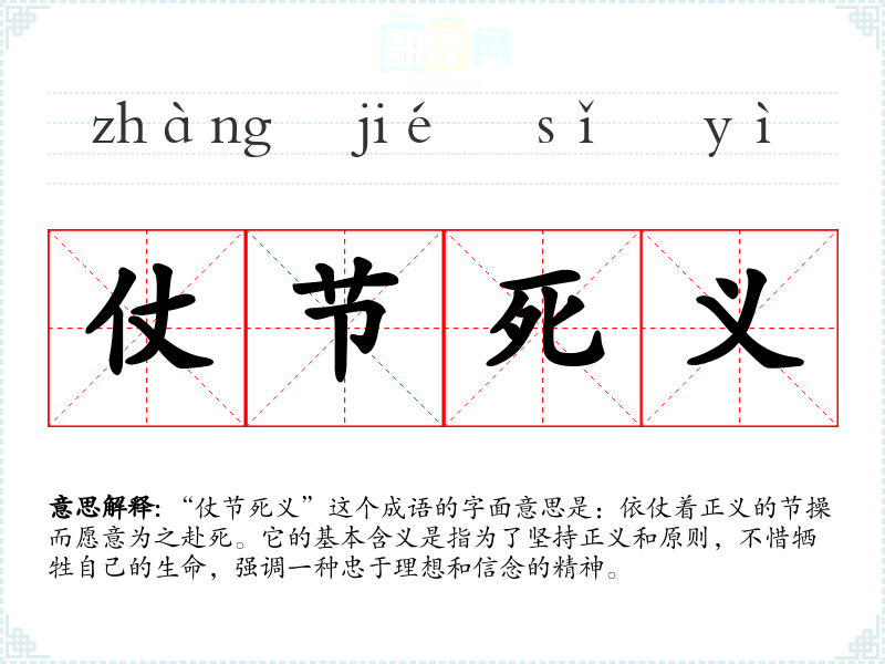 “仗节死义”这个成语的字面意思是:依仗着正义的节操而愿意为之赴死。它的基本含义是指为了坚持正义和原则,不惜牺牲自己的生命,强调一种忠于理想和信念的精神。