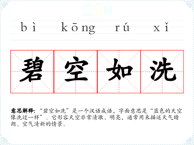 该成语的词源并不明确,但“碧空”指的是清澈的蓝天,“如洗”则形象地表达了天空的纯净。类似的表达在古代诗词中常见,许多文人墨客在描写自然景观时,都会用到类似的意象,表现出对美好天气的赞美。