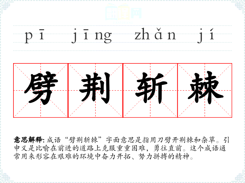 成语“劈荆斩棘”字面意思是指用刀劈开荆棘和杂草。引申义是比喻在前进的道路上克服重重困难,勇往直前。这个成语通常用来形容在艰难的环境中奋力开拓、努力拼搏的精神。