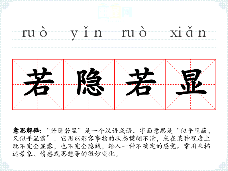 “若隐若显”源自古代文人对事物状态的观察。虽然具体的文学出处不详,但可以推测这个成语可能与古代诗词中描写自然景象或情感的模糊状态有关。它反映了**古典文化中对形象与意象的思考,尤其是在山水画、诗歌中常常体现的“虚实相生”的哲学。