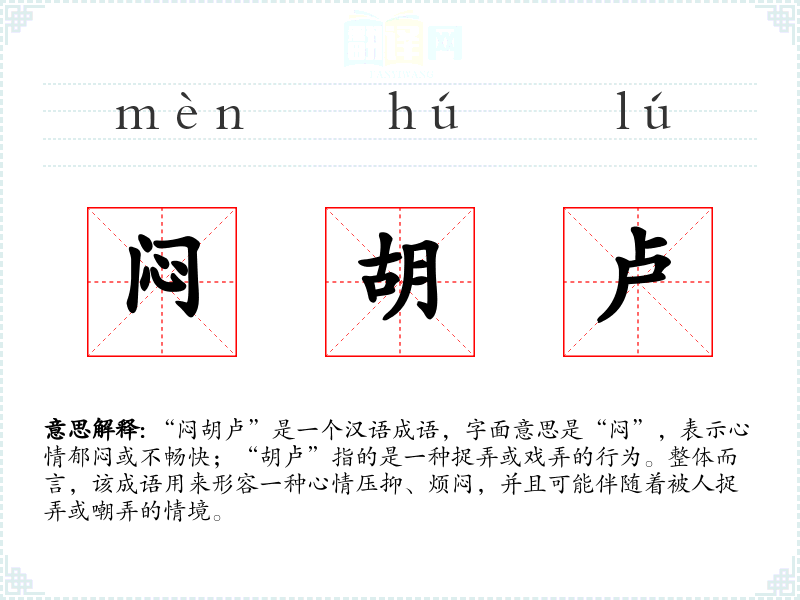 “闷胡卢”是一个汉语成语,字面意思是“闷”,表示心情郁闷或不畅快;“胡卢”指的是一种捉弄或戏弄的行为。整体而言,该成语用来形容一种心情压抑、烦闷,并且可能伴随着被人捉弄或嘲弄的情境。