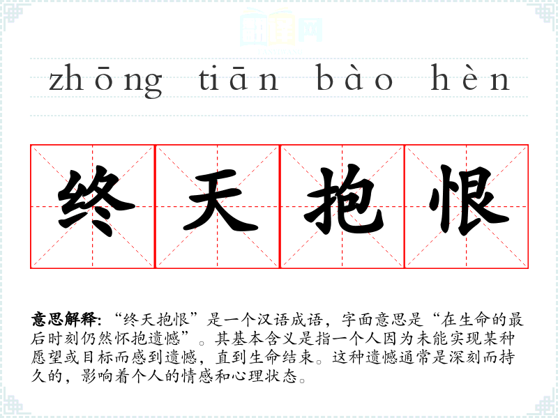 在**文化中,遗憾是一种普遍的情感体验,常常与人生的无常和命运的无奈相联系。“终天抱恨”不仅反映了个人的情感,也反映了对人生哲学的思考。在现代社会中,人们依然会用这个成语来表达对未实现梦想的追悔,尤其是在经历重大变故或老去时。