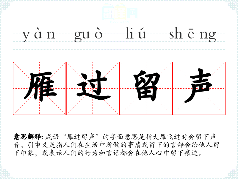 成语“雁过留声”的字面意思是指大雁飞过时会留下声音。引申义是指人们在生活中所做的事情或留下的言辞会给他人留下印象,或表示人们的行为和言语都会在他人心中留下痕迹。