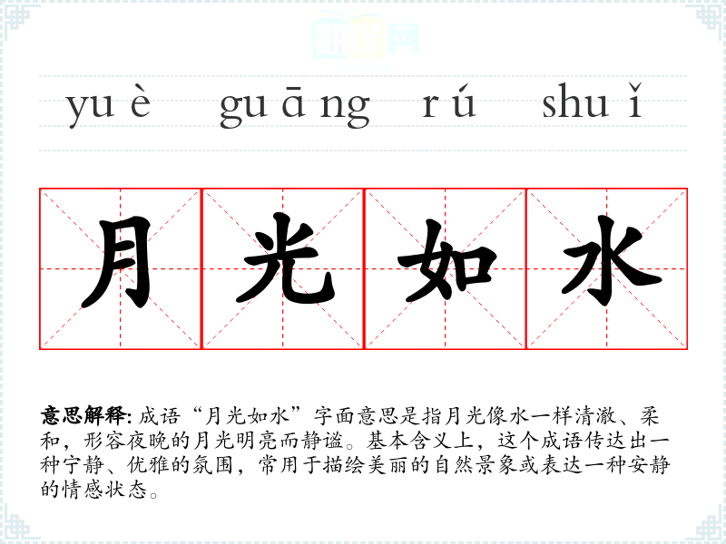 成语“月光如水”字面意思是指月光像水一样清澈、柔和,形容夜晚的月光明亮而静谧。基本含义上,这个成语传达出一种宁静、优雅的氛围,常用于描绘美丽的自然景象或表达一种安静的情感状态。