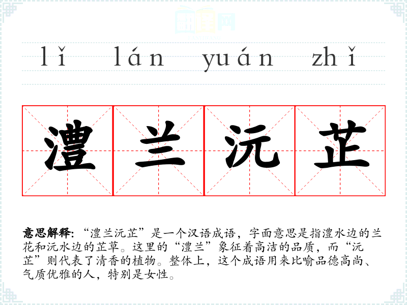“澧兰沅芷”是一个汉语成语,字面意思是指澧水边的兰花和沅水边的芷草。这里的“澧兰”象征着高洁的品质,而“沅芷”则代表了清香的植物。整体上,这个成语用来比喻品德高尚、气质优雅的人,特别是女性。