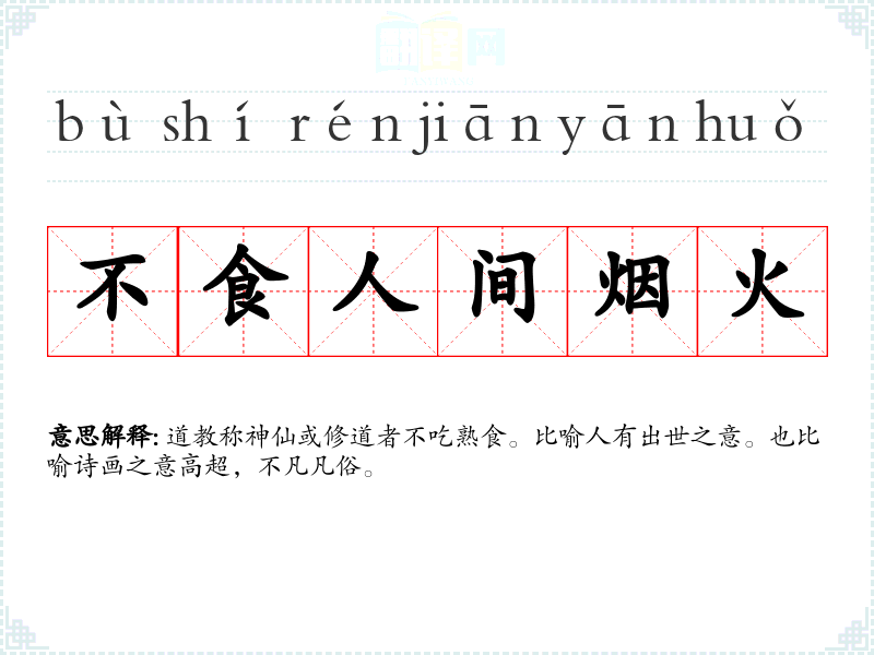 | 不食人间烟火 | 道教称神仙或修道者不吃熟食。比喻人有出世之意。也比喻诗画之意高超,不凡凡俗。 |