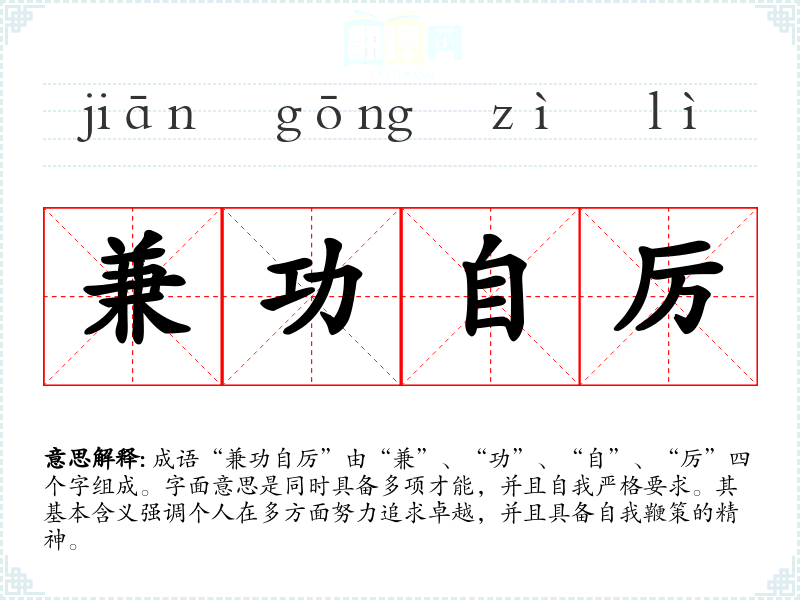 成语“兼功自厉”由“兼”、“功”、“自”、“厉”四个字组成。字面意思是同时具备多项才能,并且自我严格要求。其基本含义强调个人在多方面努力追求卓越,并且具备自我鞭策的精神。