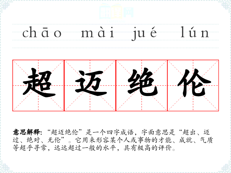 “超迈绝伦”是一个四字成语,字面意思是“超出、迈过、绝对、无伦”。它用来形容某个人或事物的才能、成就、气质等超乎寻常,远远超过一般的水平,具有极高的评价。
