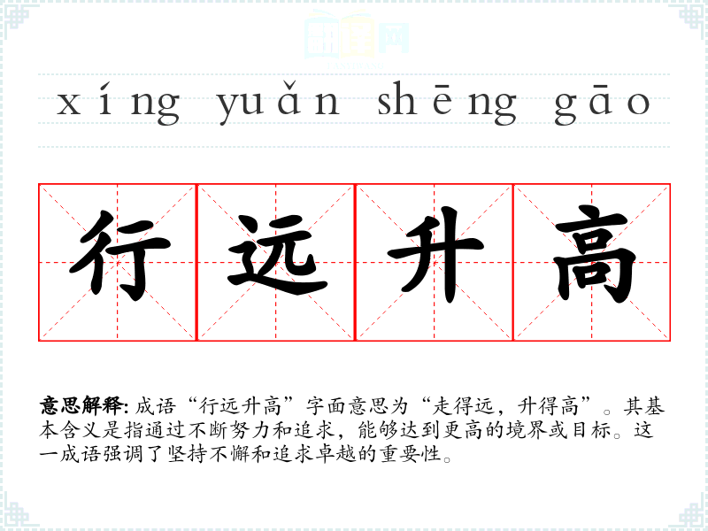 成语“行远升高”字面意思为“走得远,升得高”。其基本含义是指通过不断努力和追求,能够达到更高的境界或目标。这一成语强调了坚持不懈和追求卓越的重要性。
