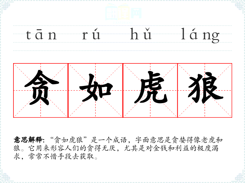 | 贪如虎狼 | 像猛虎恶狼一般贪得无厌。 |