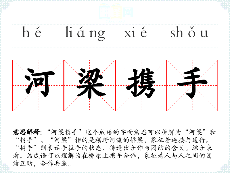 “河梁携手”这个成语的字面意思可以拆解为“河梁”和“携手”。“河梁”指的是横跨河流的桥梁,象征着连接与通行。“携手”则表示手拉手的状态,传递出合作与团结的含义。综合来看,该成语可以理解为在桥梁上携手合作,象征着人与人之间的团结互助,合作共赢。