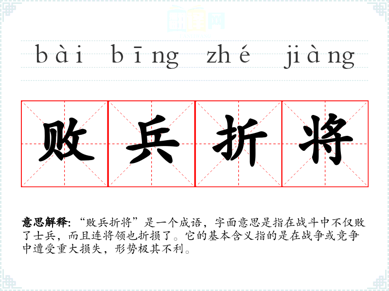 “败兵折将”是一个成语,字面意思是指在战斗中不仅败了士兵,而且连将领也折损了。它的基本含义指的是在战争或竞争中遭受重大损失,形势极其不利。