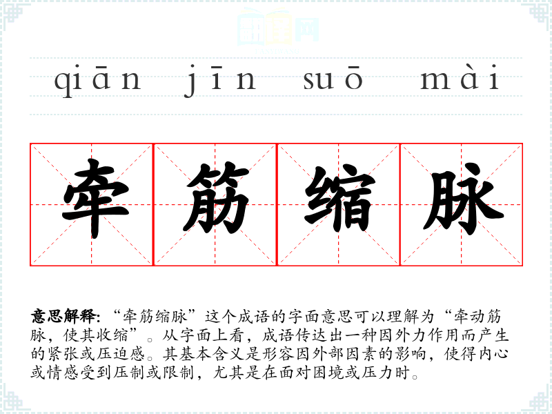“牵筋缩脉”这个成语的字面意思可以理解为“牵动筋脉,使其收缩”。从字面上看,成语传达出一种因外力作用而产生的紧张或压迫感。其基本含义是形容因外部因素的影响,使得内心或情感受到压制或限制,尤其是在面对困境或压力时。