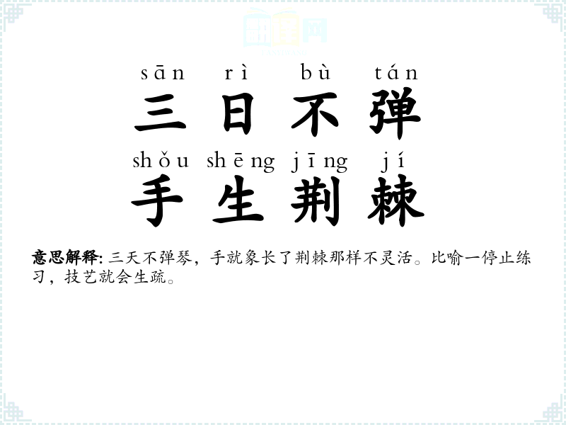 三天不弹琴,手就象长了荆棘那样不灵活。比喻一停止练习,技艺就会生疏。 |