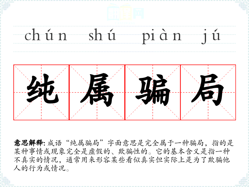 成语“纯属骗局”字面意思是完全属于一种骗局,指的是某种事情或现象完全是虚假的、欺骗性的。它的基本含义是指一种不真实的情况,通常用来形容某些看似真实但实际上是为了欺骗他人的行为或情况。